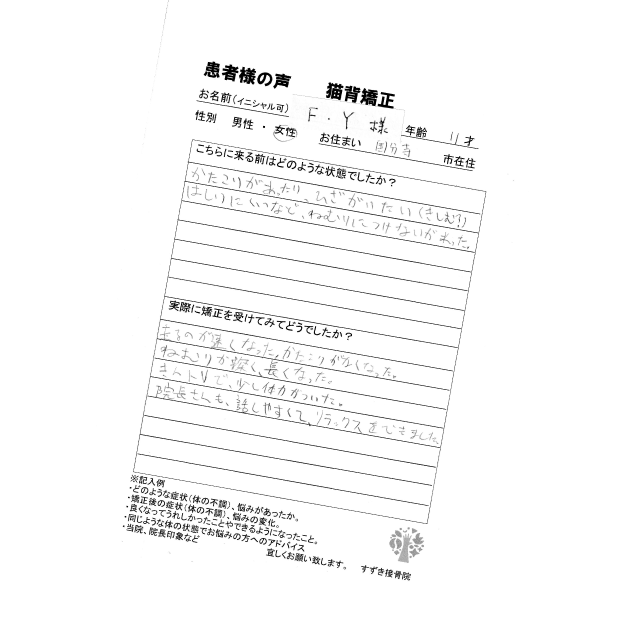 体の芯から改善してくれるので、一時的な効果ではなく継続的な効果が見られます。今では朝もスッと起きられて部活動も盛んに取り組めています。また、猫背矯正体操や体に良いクッション、白湯などをどんどん教えてくれるので自分の意識も変わりました。